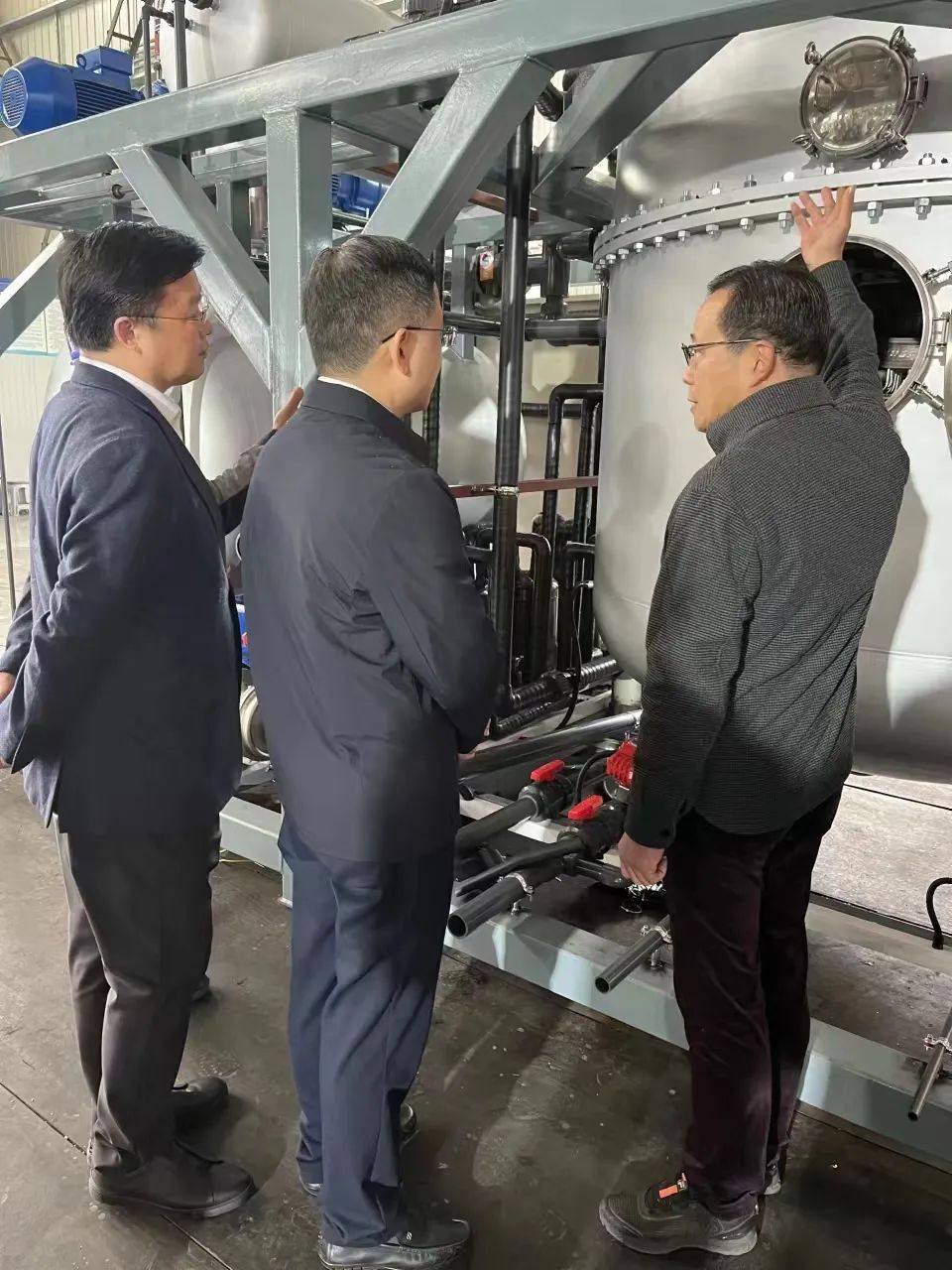 為進一步加強和促進朗盼環境的安全生產和消防工作,確保元旦假期間的車間安全生產形式穩定、保障節后安全生產平穩有序。12月30日,無錫市濱湖區區委書記孫海東、區長李平一行蒞臨朗盼環境進行了全面的安全檢查,并查看了解了我司自主研發的環保設備-低溫熱泵真空蒸發器。由我司董事長鮑偉東、總經理鮑天鈺、鮑天鈞及車間安全生產管理員進行接待講解。